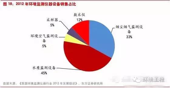 2012年我國環(huán)境監(jiān)測儀器行業(yè)共銷售儀器27195臺,實現(xiàn)銷售總額44億元。其中煙氣類監(jiān)測設備占33%,水質(zhì)監(jiān)測占45%,空氣類監(jiān)測占12%。前兩者均為污染源監(jiān)測,總和達78%。目前,環(huán)境質(zhì)量監(jiān)測設備投資仍處于極低水平;同時,從污染源監(jiān)測角度看,主要以單一污染源監(jiān)測為主,已無法適應目前的多污染源管控的高標準要求。在新的環(huán)保政策和監(jiān)測技術標準下,存量設備更新升級,新增設備市場擴容在即,行業(yè)進入全面推進時期。
